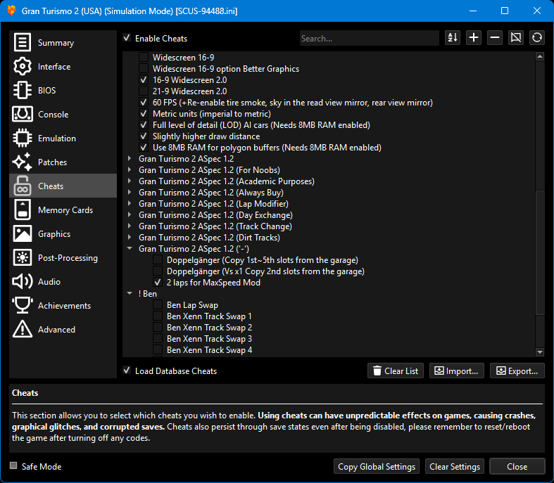 Enable Cheats | Enabled | Native 60fps is unlocked by a cheat code using GT Hi-Fi mode left-overs. |